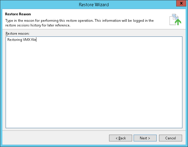 At the Restore Reason step of the wizard, enter a reason for restoring VM file(s). The information you provide will be saved in the session history and you can reference it later.