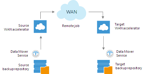 WAN accelerators are dedicated components responsible for global data caching and data deduplication. Technically, WAN accelerators add a new layer in the backup infrastructure — between the Veeam Data Movers on the source side and the Veeam Data Mover on the target side.