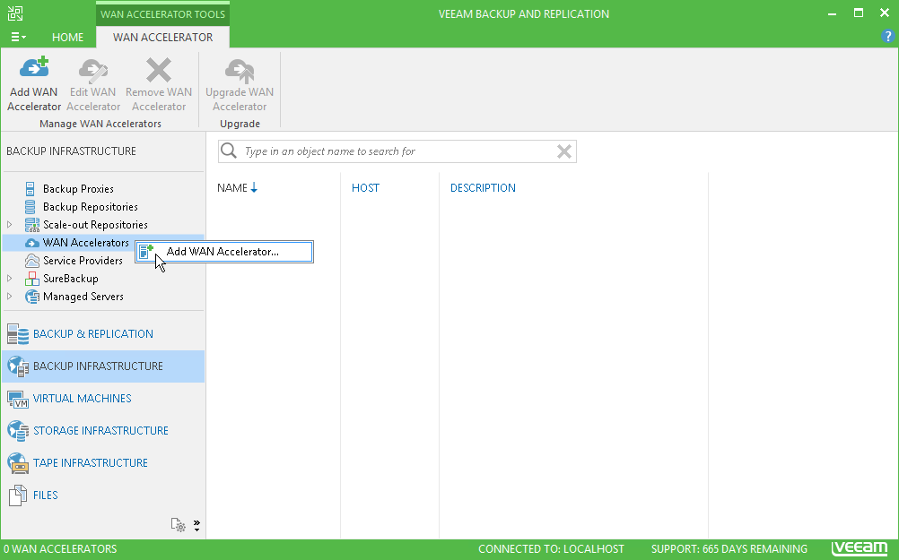 - Open the Backup Infrastructure view, in the inventory pane select WAN Accelerators and click Add WAN Accelerator on the ribbon.