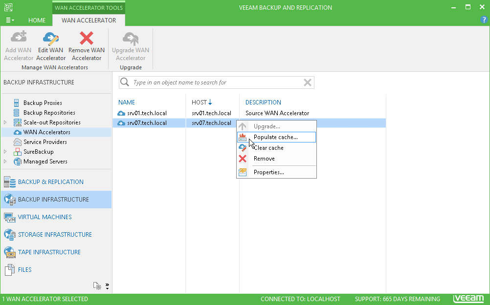 - In the working area, right-click the target WAN accelerator and select Populate cache.