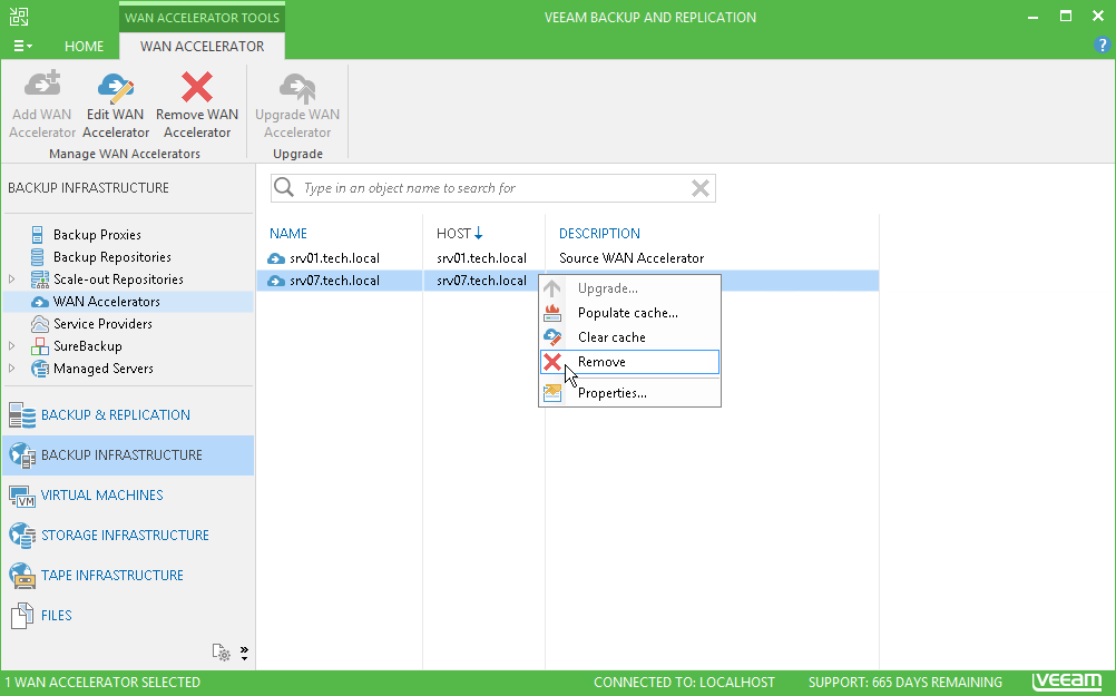 - In the working area, select the WAN accelerator and click Remove WAN Accelerator on the ribbon or right-click the WAN accelerator and select Remove.