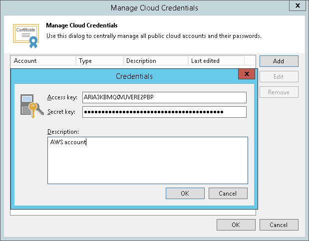 Since Veeam Backup & Replication uses AWS CLI commands to perform operations in AWS, instead of a user name and password you must specify an AWS access key. AWS access keys are long-term user credentials that consists of two parts: an access key ID and a secret access key. For details, see the Managing Access Keys for IAM Users section in the AWS IAM User Guide.