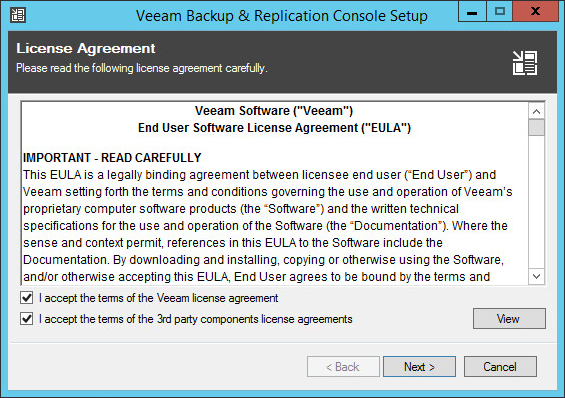 At the License Agreement step of the wizard, you must accept the license agreement for Veeam and 3rd party components that Veeam incorporates. If you do not accept the license agreement, you will not be able to pass to next step of the setup wizard.