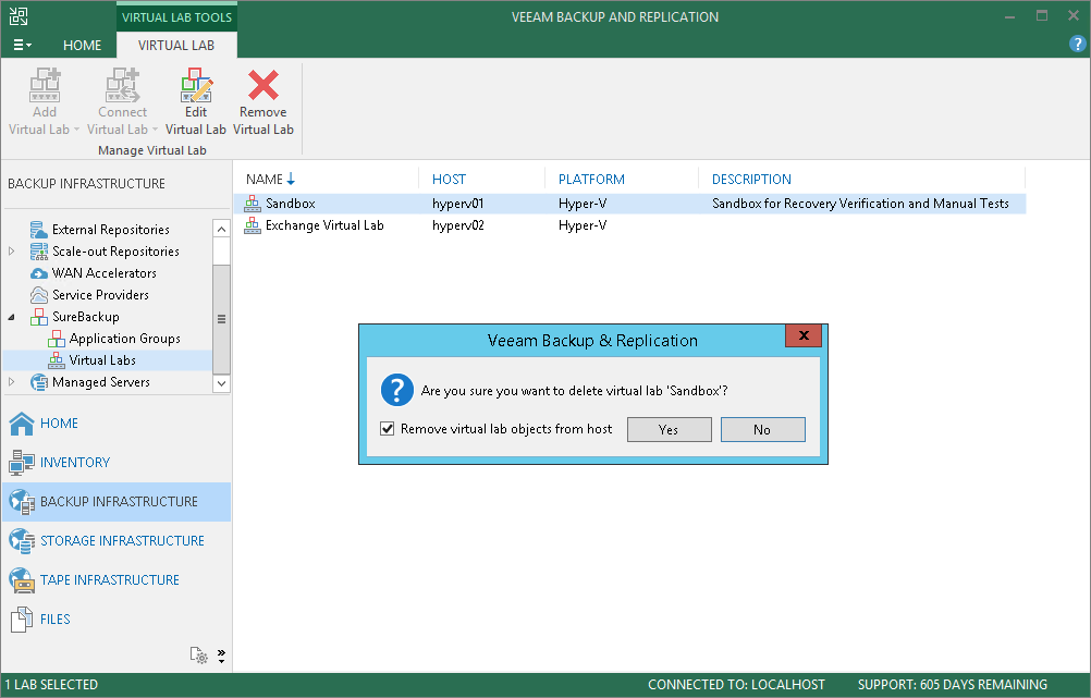 - If you want to remove virtual lab objects from the virtual environment, in the displayed window select the Remove virtual lab objects from host check box. If you do not select this option, Veeam Backup & Replication will disconnect the virtual lab from the backup server. You will be able to connect to this virtual lab later.