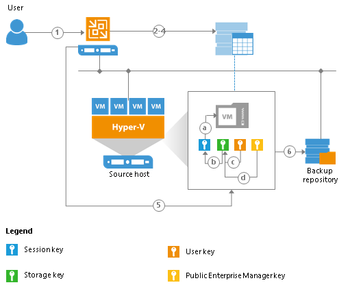 - Veeam Backup & Replication creates a session key and a metakey. The metakey is stored to the configuration database.