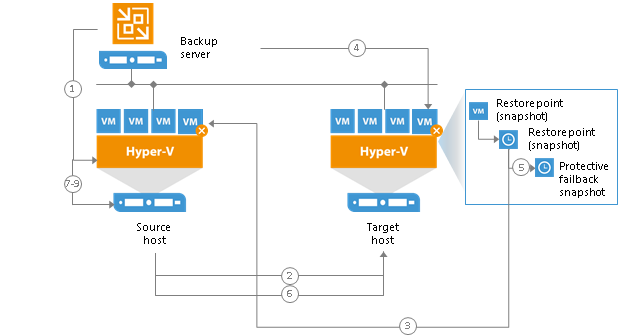 - Veeam Backup & Replication creates a failback protective snapshot for the VM replica. The snapshot acts as a new restore point and saves the pre-failback state of the VM replica. You can use this snapshot to return to the pre-failback state of the VM replica afterwards.