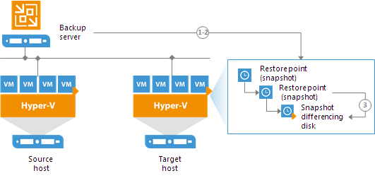 - All changes made to the VM replica while it is running in the Failover state are written to the differencing disk (AVHD/AVHDX) of the snapshot, or restore point, to which you have selected to roll back.