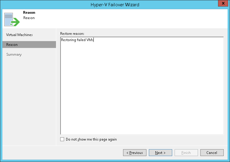 At the Reason step of the wizard, enter a reason for failing over to VM replicas. The information you provide will be saved in the session history and you can reference it later.