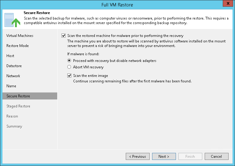 You can instruct Veeam Backup & Replication to perform secure restore — scan machine data with antivirus software before restoring the machine to the production environment. For more information on secure restore, see Secure Restore.
