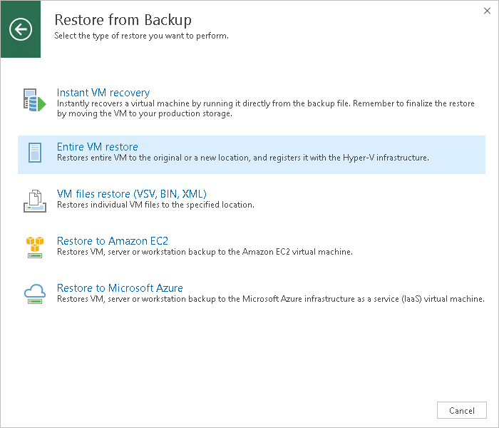 - On the Home tab, click Restore > Microsoft Hyper-V > Restore from backup > Entire VM restore > Entire VM restore.