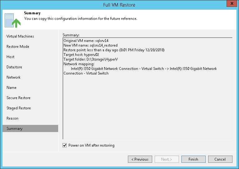 - If you want to start the restored VM on the target host, select the Power on VM after restoring check box.