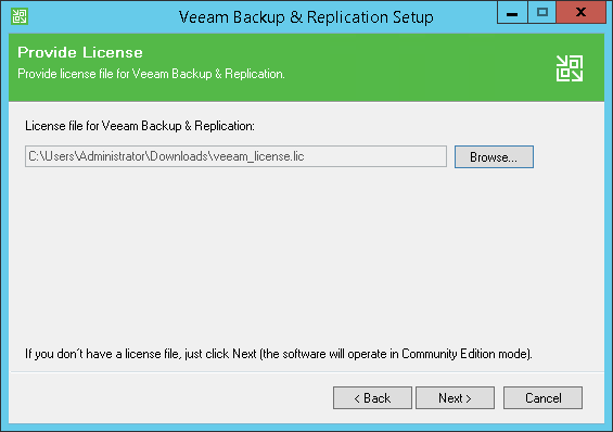 When you install Veeam Backup & Replication, you are asked to specify a path to the license file. If you do not specify a path to the license file, Veeam Backup & Replication will run in the community (free) version. For more information about product versions, see Community Edition and Full Version.