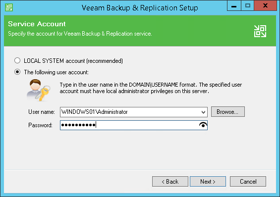 You can select an account under which you want to run the Veeam Backup Service: