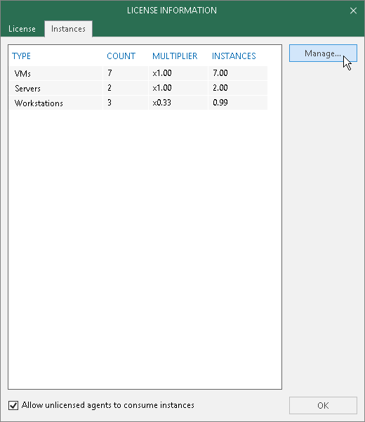 The number of license instances that a protected workload consumes depends on the workload type and product edition. For example, 1 VM in the Enterprise Plus edition of Veeam Backup & Replication consumes 1 instance, whereas 1 workstation machine in the same product edition consumes 0.33 instances. For details, see Veeam Licensing Policy.