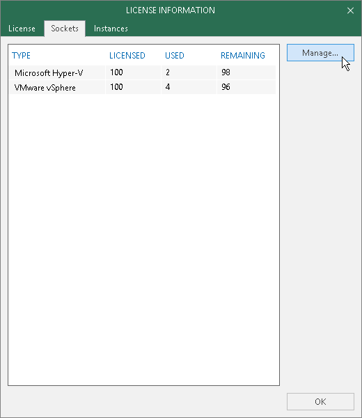 When you run a job, Veeam Backup & Replication applies a license to a protected workload (for per-instance licenses) or to the virtualization host on which processed VMs reside (for per-socket licenses). You can view to which objects the license is currently applied.