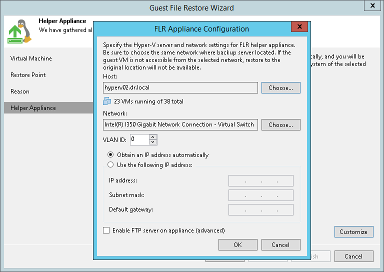 - To enable FTP access to the restored file system, select the Enable FTP server on appliance (advanced) check box. As a result, users will be able to access the helper appliance over FTP, browse the file system of the restored VM and download necessary files on their own.