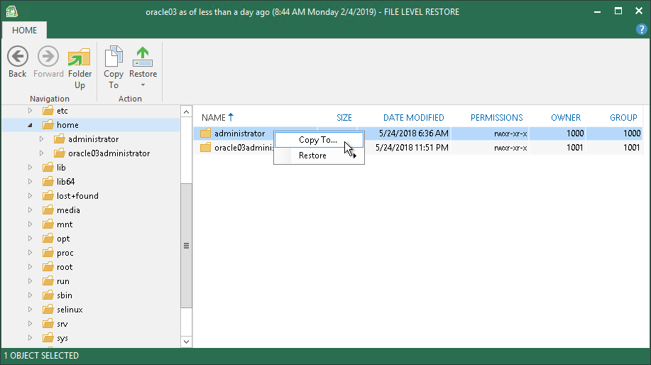 To restore files and folders to the original location, right–click the necessary file or folder in the file system tree or in the details pane on the right and select one of the following commands: