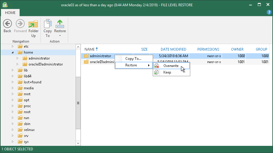 - To overwrite the original file on the VM guest OS with the file restored from the backup, select Restore > Overwrite.
