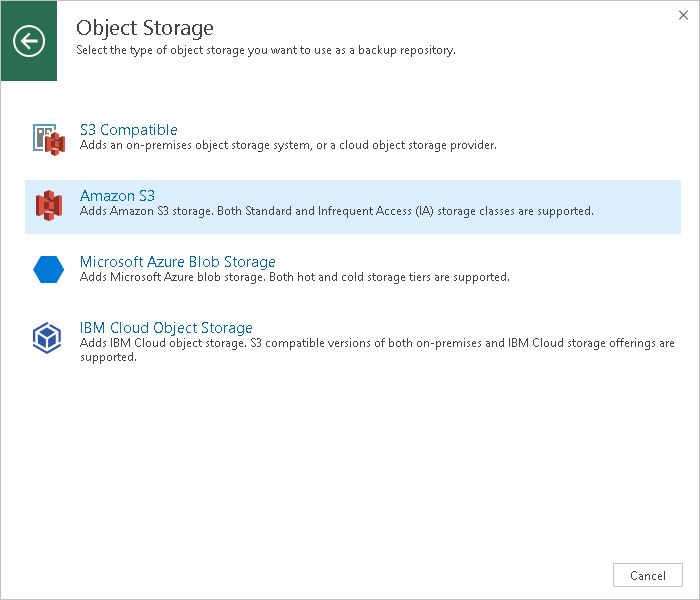 - Open the Backup Infrastructure view, in the inventory pane select the Backup Repositories node and click Add Repository on the ribbon. In the Add Backup Repository dialog, select Object Storage > Amazon S3.