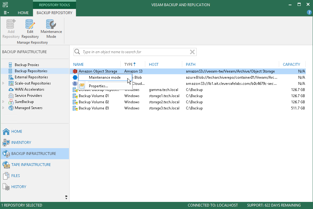- In the working area, select an object storage repository and click Maintenance mode on the ribbon or right-click an object storage repository and select Maintenance mode.