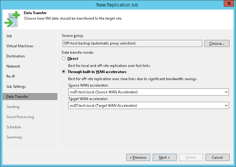 At the Data Transfer step of the wizard, select backup infrastructure components that must be used for the replication process and choose a path for VM data transfer.