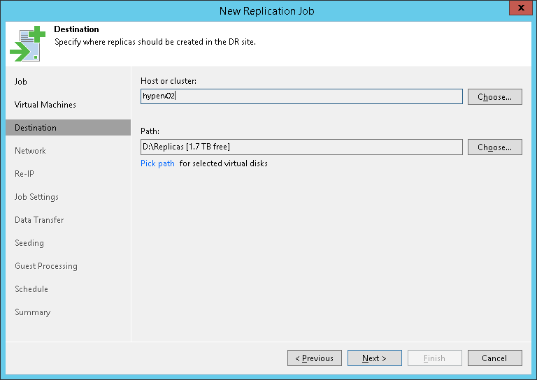 - In the Path section, specify a path to the folder where VM replica files must be stored. By default, Veeam Backup & Replication stores VM replica files to the C:\Replicas folder (if you have selected a Microsoft Hyper-V host as a target) or on a CSV with the maximum amount of free space (if you have selected a Microsoft Hyper-V cluster as a target).