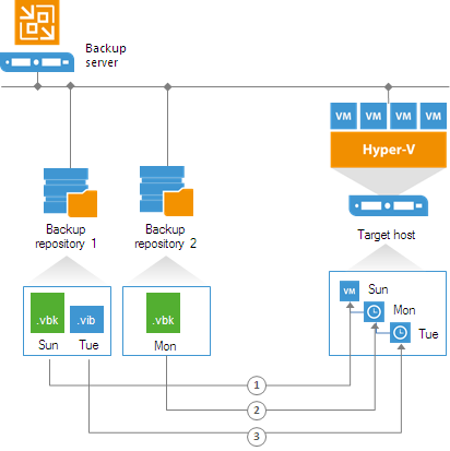 - On Tuesday, the replication job will retrieve VM data from the incremental backup file in Backup repository 1.
