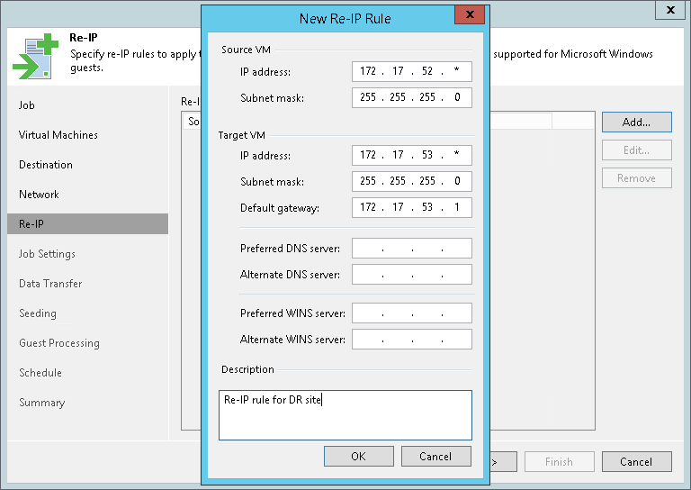 Re-IP rules can be helpful if the IP addressing scheme in the production site differs from the IP addressing scheme in the DR site. In this situation, you can configure a number of re‑IP rules for the replication job. When you perform failover, Veeam Backup & Replication will check if configured Re-IP rules apply for the VM replica. If a Re-IP rule applies, the VM replica will get a new IP address according to the new network mask, and you will be able to reach this VM replica in the DR site.