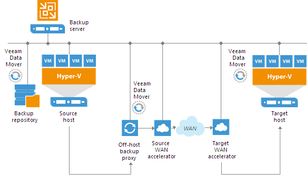 - Off-host backup proxy. The off-host backup proxy must be deployed in the source site and must have access to the source host and the target host. The source Veeam Data Mover runs on the off-host backup proxy.
