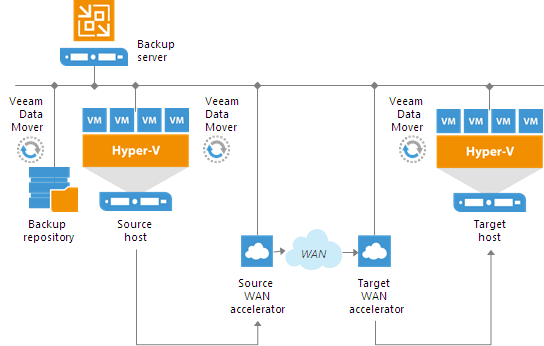 On-host replication can be used when you replicate VMs over the LAN or WAN. This scenario requires the following backup infrastructure components: