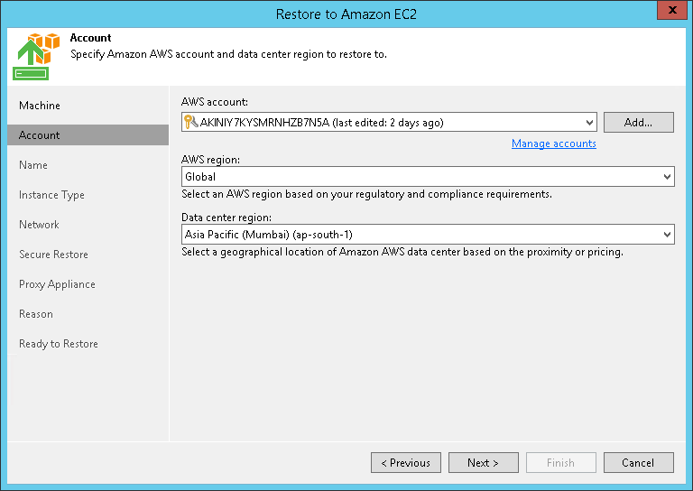 - From the AWS account list, select user credentials to connect to AWS. If you have not set up credentials beforehand in the Cloud Credentials Manager, click the Manage accounts link or click Add on the right to add the necessary credentials.