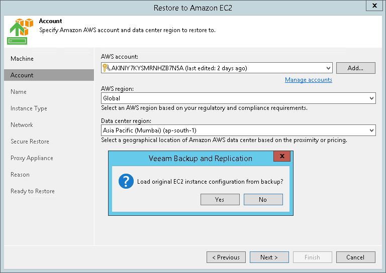 If you restore an EC2 instance from backups created with Veeam Backup for AWS to the same AWS region where the instance is placed, after you click Next, the wizard will offer you to use region settings associated with this instance.
