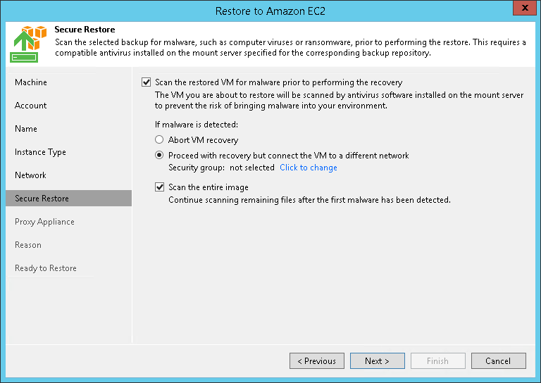 You can instruct Veeam Backup & Replication to perform secure restore — scan machine data with antivirus software before restoring the machine to Amazon EC2. For more information on secure restore, see Secure Restore.