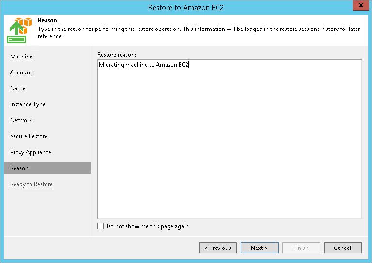 At the Reason step of the wizard, enter a reason for restoring the machine. The information you provide will be saved in the session history in Veeam Backup & Replication, and you can view it later.
