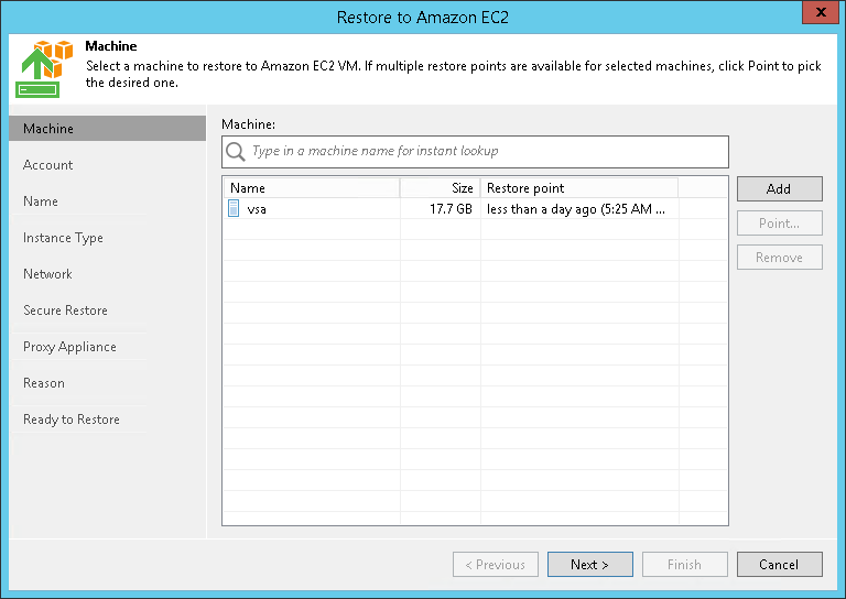 At the Machine step of the wizard, specify the machine that you plan to restore and specify a restore point to which you want to restore the machine.