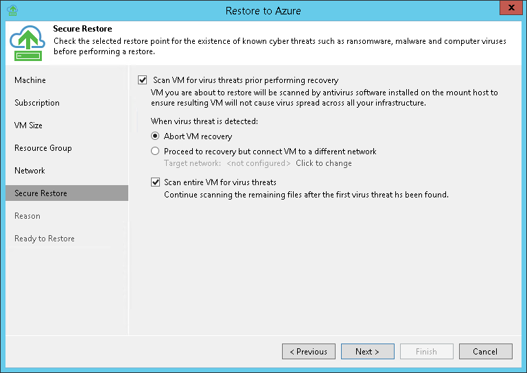 You can instruct Veeam Backup & Replication to perform secure restore — scan machine data with antivirus software before restoring the machine to Microsoft Azure or Azure Stack. For more information on secure restore, see Secure Restore.