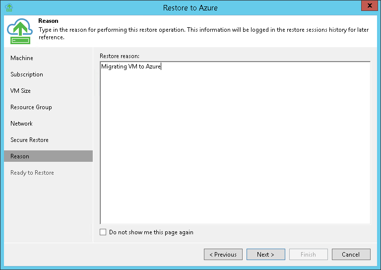 At the Reason step of the wizard, enter a reason for restoring the machine. The information you provide will be saved in the session history in Veeam Backup & Replication, and you can view it later.