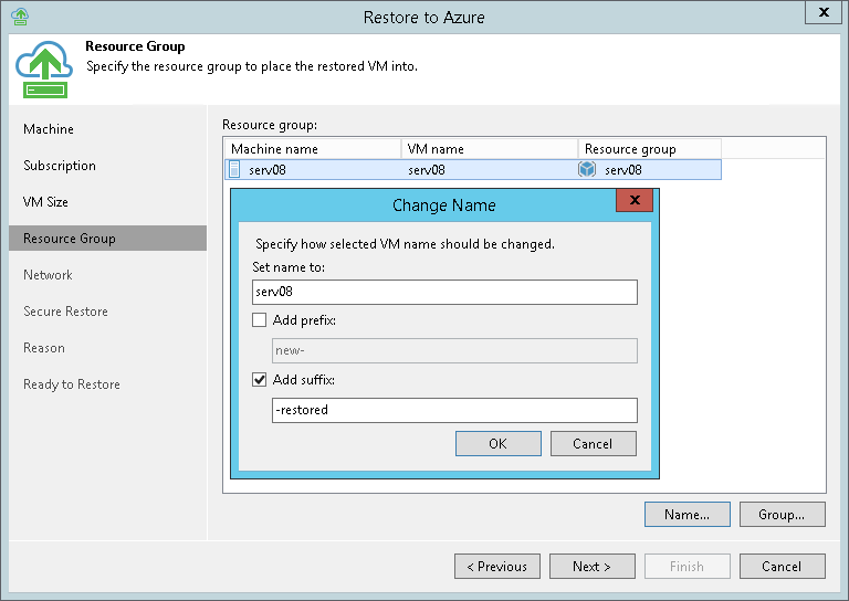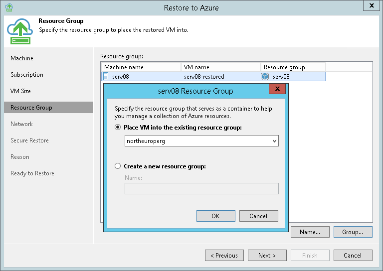By default, Veeam Backup & Replication creates a new resource group for the restored machine and places the machine to it. If necessary, you can place the machine to an existing resource group.