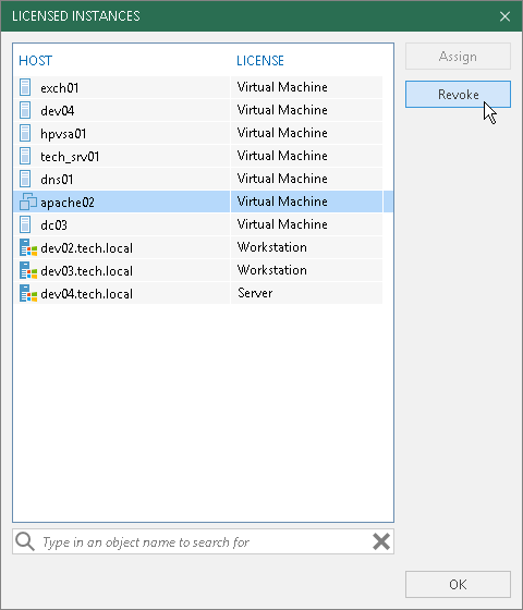 - In the displayed window, select a protected workload or a licensed host and click Revoke. Veeam Backup & Replication will revoke the license from the selected object, and the license will be freed for other objects in the backup infrastructure.