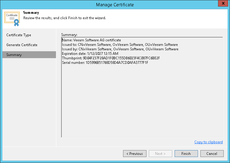 - At the Summary step of the wizard, review the certificate properties. Use the Copy to clipboard link to copy and save information about the generated TLS certificate. You will be able to use the copied information to verify the TLS certificate with the certificate thumbprint.