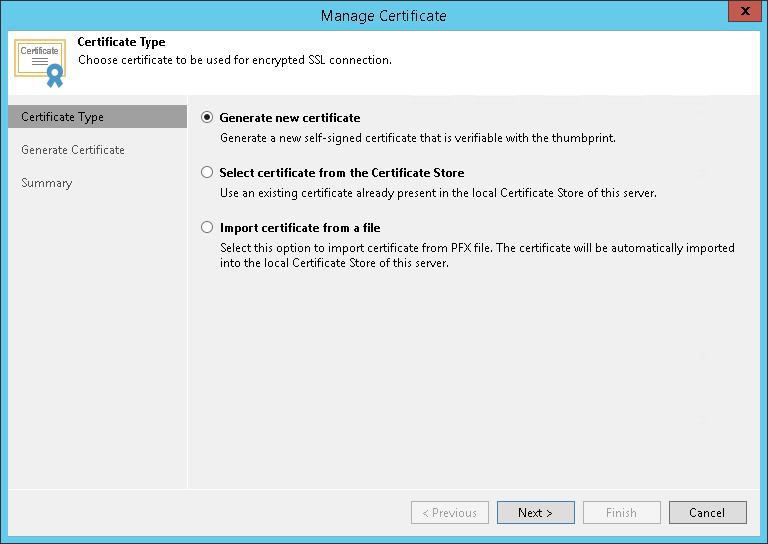 - Click Finish. Veeam Backup & Replication will save the generated certificate in the Shared certificate store on the Veeam backup server.