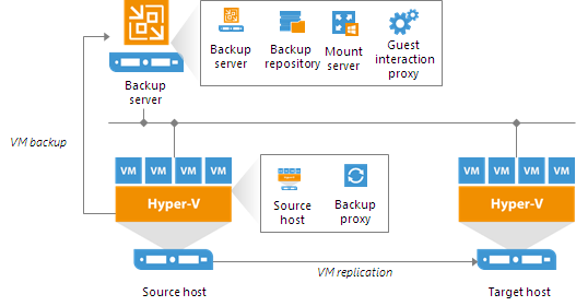 In Hyper-V environments that require a large number of backup or replication activities to be performed, the simple deployment scheme is not appropriate due to the following reasons: