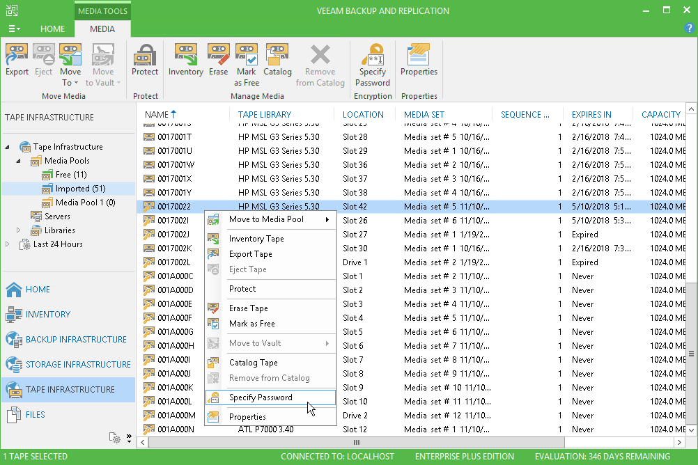 If you enter a correct password, Veeam Backup & Replication will decrypt the tape media. The tape will be moved under the corresponding media pool in the inventory pane. You can perform restore operations for data archived to tape as usual.