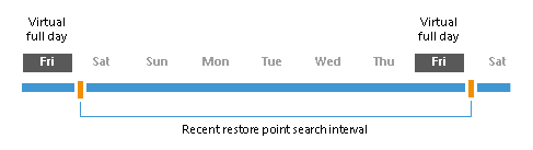 When the tape job needs to create a new virtual full, it analyzes the tape archive and detects the date of the last virtual full on tape. To create a new virtual full, the tape job needs restore points that were created in the following interval: