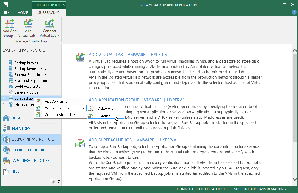 - Open the Backup Infrastructure view, in the inventory pane select SureBackup. In the working area, click Add Virtual Lab > Hyper-V.