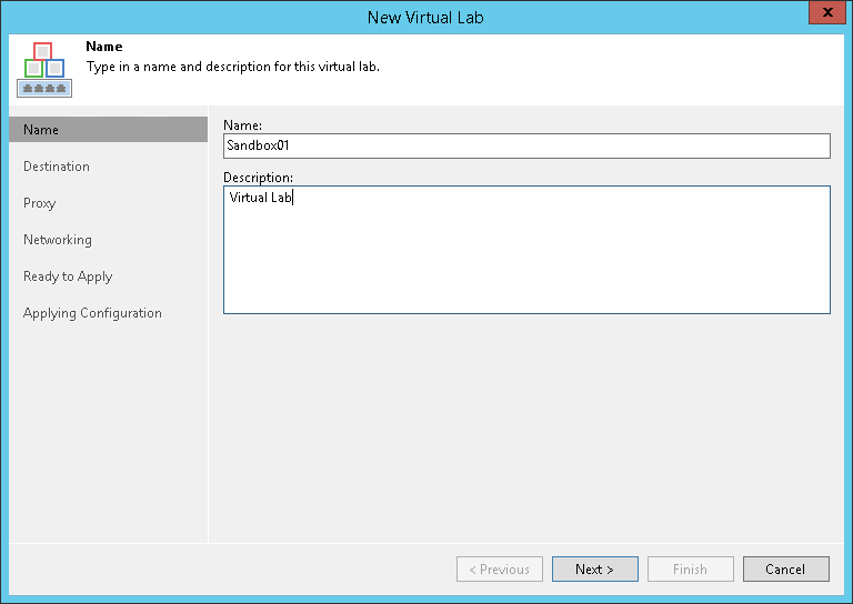 At the Name step of the wizard, specify a name and description for the virtual lab.