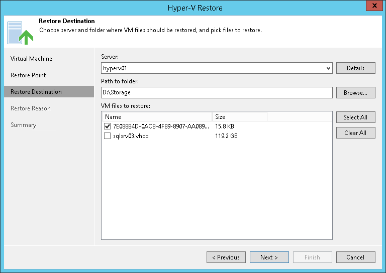 At the Restore Destination step of the wizard, select the VM files you want to restore and destination where the restored files must be stored.