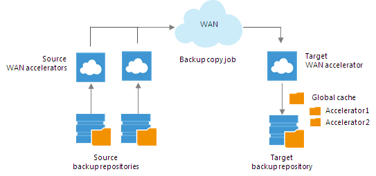 When one target WAN accelerator is used by several source WAN accelerators, Veeam Backup & Replication can copy data blocks between global cache of these WAN accelerators. This mechanism works if there are no matching backups of VMs on the target backup repository, but matching data is available in cache of other WAN accelerators.