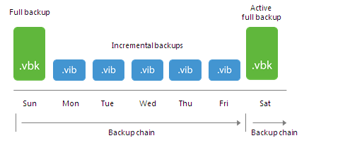 If a regular backup job is scheduled together with active full backup, Veeam Backup & Replication will produce only one backup file — an active full backup that will contain the latest state of the source VM. An incremental backup file that should have been created by the backup job schedule will not be added to the backup chain.