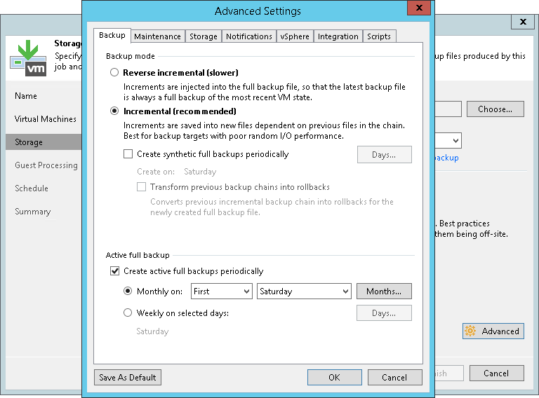 - To schedule active full backups, specify scheduling settings in the Advanced section of a corresponding backup job. You can schedule active full backups to run weekly, for example, every Saturday, or monthly, for example, every fourth Sunday of a month.